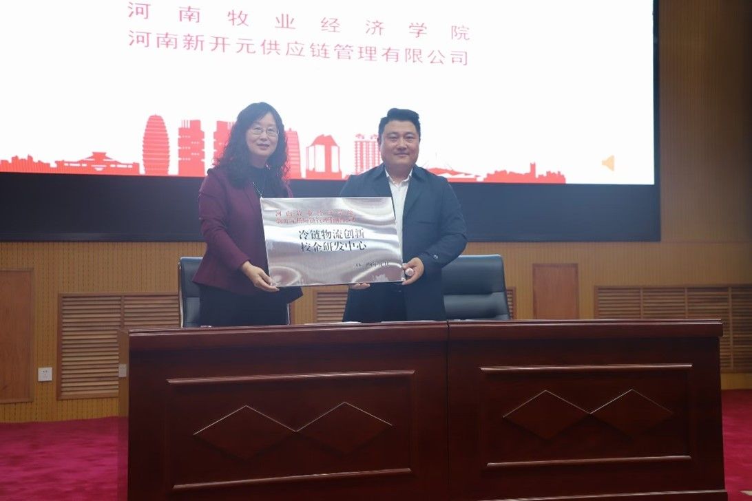 会上,科学技术处处长潘春梅代表学校致开幕辞。物流与电商学院院长曹献存代表承办单位致欢迎辞。潘春梅与河南新开元供应链有限公司总经理陈世举共同签署校企研发中心合作协议并授牌,物流与电商学院党委书记田景丽为企业嘉宾颁发聘书。来自物流行业、企业、研究中心的与会嘉宾围绕“数智赋能农产品供应链”主题展开分享与讨论。