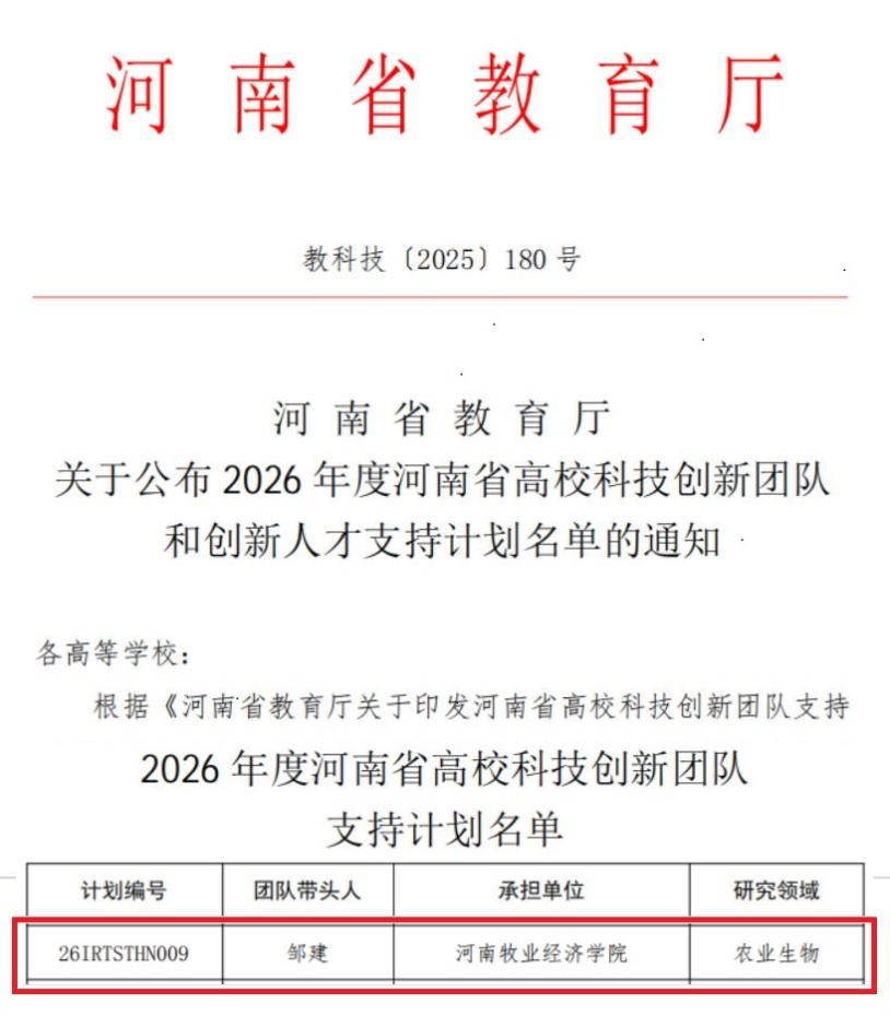 近日,河南省教育厅公布2026年度河南省高校科技创新团队支持计划名单,威尼斯官网食品与生物工程学院邹建教授牵头的“畜禽副产物高值化利用及智能装备研发团队”成功入选,获得专项科研经费资助50万元。