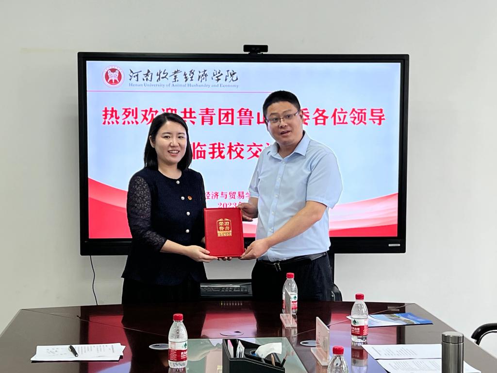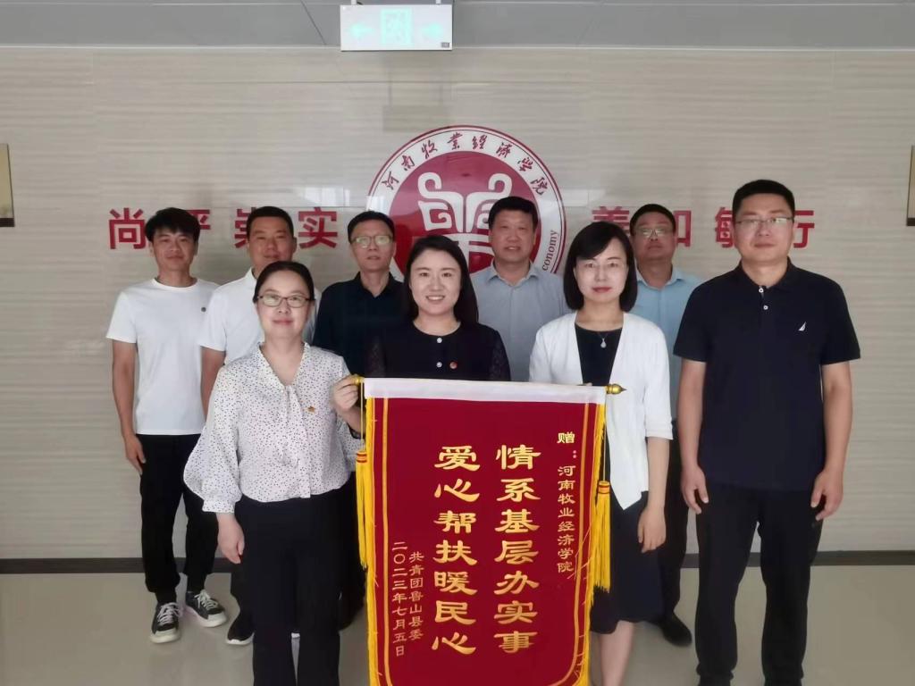 共青团鲁山县委向学校赠送了锦旗,为威尼斯官网驻鲁山县黄沟村第一团支书、经济与贸易学院团委书记刘佳楠颁发了荣誉证书。