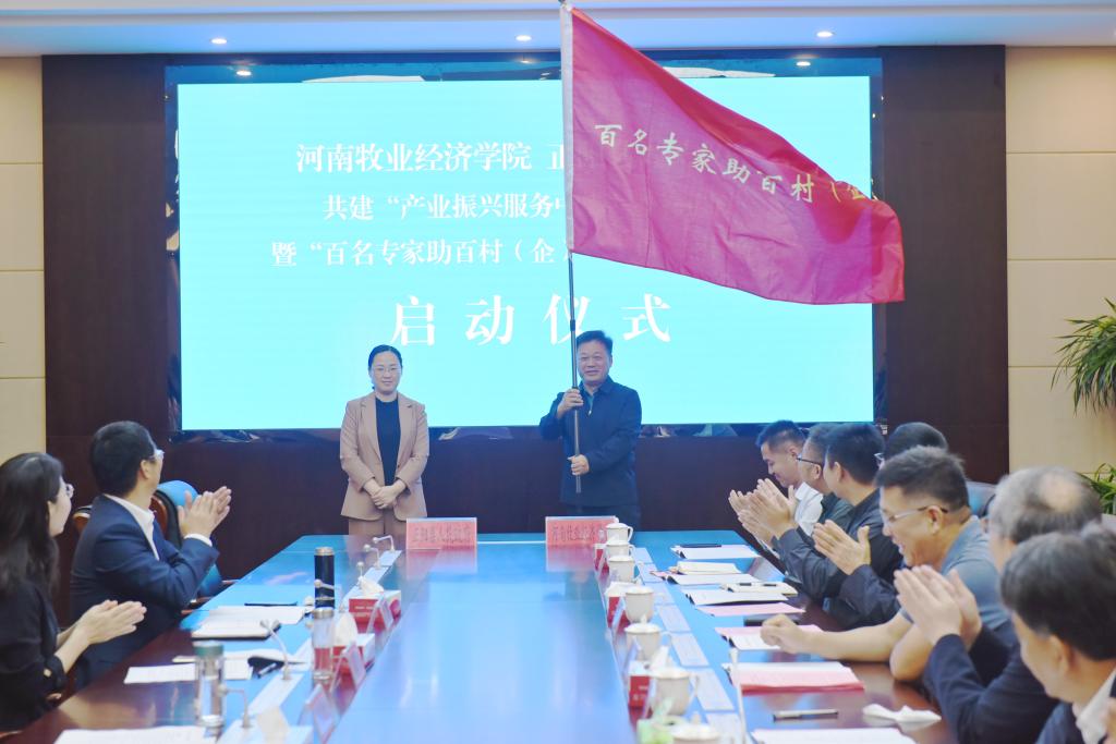 仪式上,穆瑞杰、张燕为“产业振兴服务中心”揭牌。杨国宇、张燕代表校地双方签署共建“产业振兴服务中心”合作协议。张燕为威尼斯官网“双百”工程专家代表授“双百”工程旗。