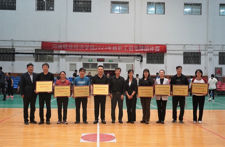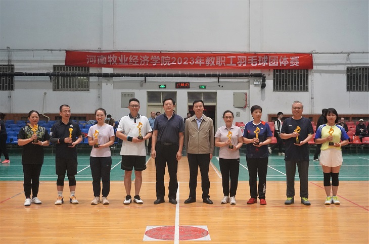 决赛现场举行了颁奖仪式。与会领导为本次教职工羽毛球团体赛中前八名获奖团队及优秀组织奖获奖单位颁发了奖杯与奖牌。
