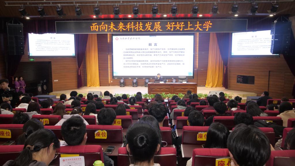罗士喜强调,科技创新是国家繁荣富强的立身之本,决定着民族前途命运。他从农业科学技术、信息与通讯技术、新能源技术、交通运输、高端制造技术等五大新兴科技入手,阐释了科技创新给人类社会的生产生活、经济发展、管理方式、粮食安全和人民福祉带来的变革。罗士喜为同学们解答了如何好好上大学的问题:作为强国一代的新时代青年,一要增强家国情怀,用爱燃起前进的不竭动力;二要通过学习孕育崇高品德,培育卓越才华;三要学好各类课程,形成学科专业思维;四要根据自己的人生规划学习掌握多种专业知识和技术技能,争取成为复合型人才;五要德智体美劳全面发展;六要不断提升学习能力和创新能力。