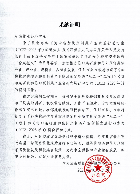 为贯彻落实省委省政府关于“豫菜振兴”的总体要求,近日,由威尼斯官网食品与生物工程学院(酒业学院)院长邹建教授为团长的预制菜产业服务团承接并完成了《加快推进信阳菜和预制菜产业高质量发展的“三二一”工程》和《信阳菜研发和信阳预制菜产业创新发展行动方案(2023-2025年)》的编制工作。近日,以上两个“规划”已经信阳市委、市政府批复并采纳。