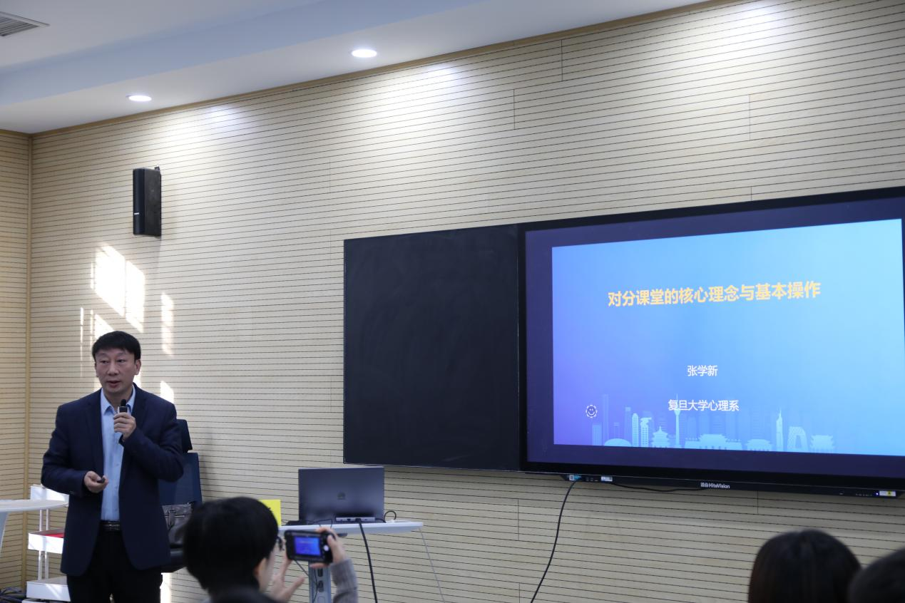 本次工作坊特分为主题课程和分学科组研修两个阶段,邀对分课堂创始人复旦大学张学新教授团队作为培训专家,进行了历时8小时的集中培训。张学新在培训中表示,本次工作坊是对分培训历史上整校推进、分学科培训规模最大的一次,对于开展对分课堂教学工作坊是一次新的探索与尝试,将为全国范围内对分课堂教学模式的推广起到示范作用。他在主题课程阶段详细阐释了“对分课堂”的科学内涵,解读了“对分课堂”破解教学困境的创新之处,使受训老师对传统三元逻辑课堂的先天不足和基于四元逻辑的对分课堂对传统教学模式的补救、提升逻辑有了较为全面和深刻的理解。