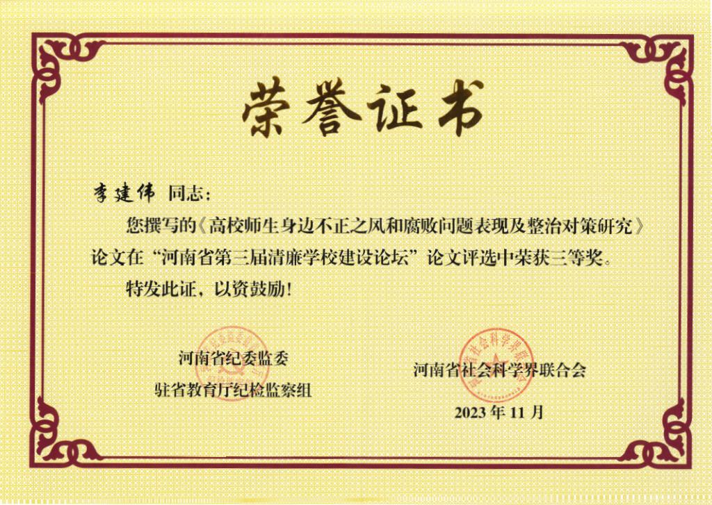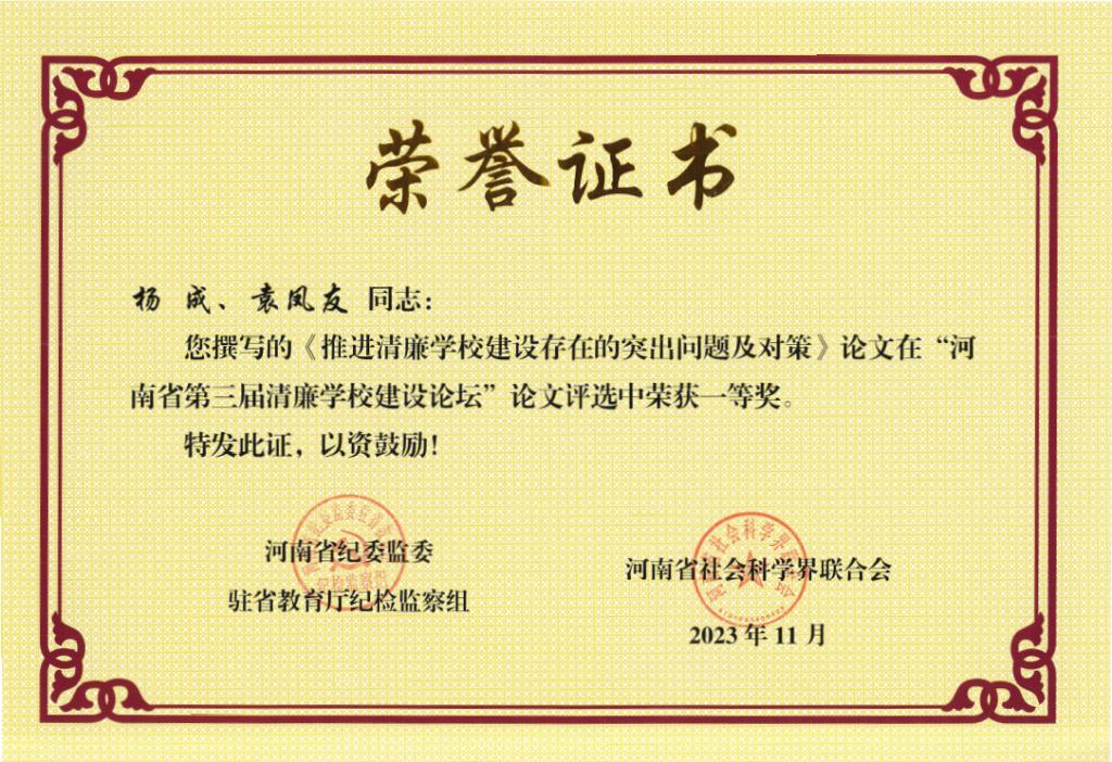 威尼斯官网对清廉学校建设工作非常重视。清廉学校建设是清廉河南建设的重要单元,是营造风清气正政治生态的重要举措。校纪委及时在全校范围内发布论文征集通知,各级党组织积极响应参与,校纪委从各单位推荐的优秀论文中遴选出8篇进行表彰并上报。此次清廉学校建设论坛论文征集活动,对威尼斯官网全面建设“清廉学校”走深走实、对威尼斯官网扎实开展全面从严治党和党风廉政建设、反腐败工作起到了积极推动作用。(杨宇 文/图)