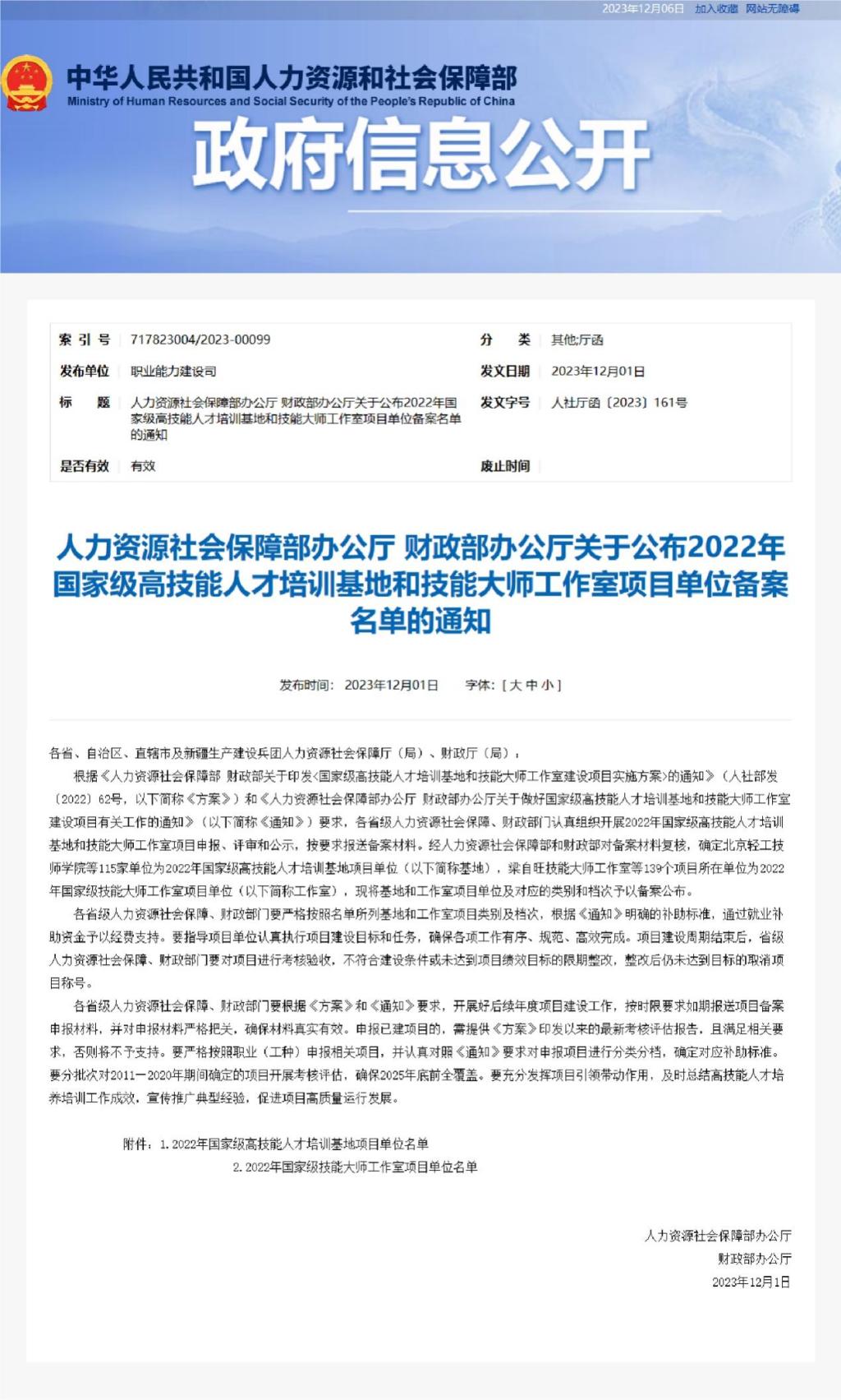 12月1日,国家人力资源社会保障部、财政部发布了《关于公布2022年国家级高技能人才培训基地和技能大师工作室项目单位备案名单的通知》,威尼斯官网艺术学院“董晓峰技能大师工作室”成功获批中华人民共和国人力资源和社会保障部、财政部2023年国家级技能大师工作室项目。