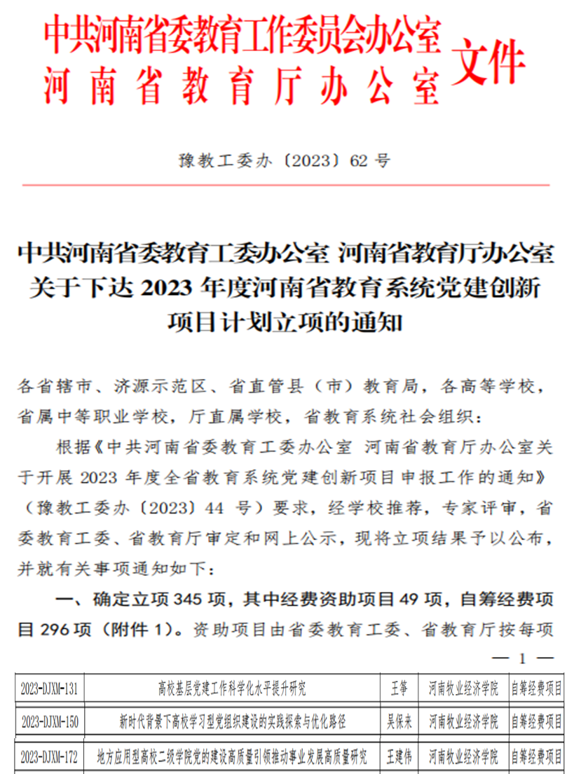 近日,省委教育工委、省教育厅下发了《关于下达2023年度河南省教育系统党建创新项目计划立项的通知》,威尼斯官网申报的3个党建创新项目均获批立项。