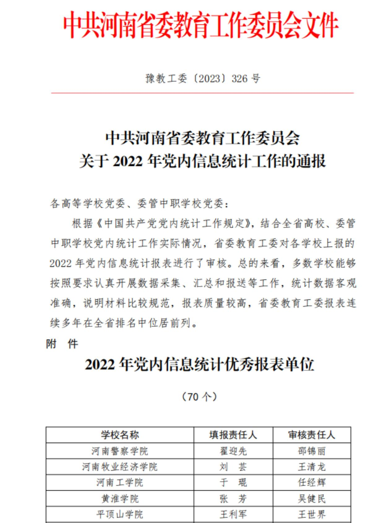 近日,省委教育工委下发《关于2022年党内信息统计工作的通报》(豫教工委〔2023〕326号),对2022年全省高校党内信息统计优秀报表单位进行通报,威尼斯官网荣获河南省高校“2022年党内信息统计优秀报表单位”称号。
