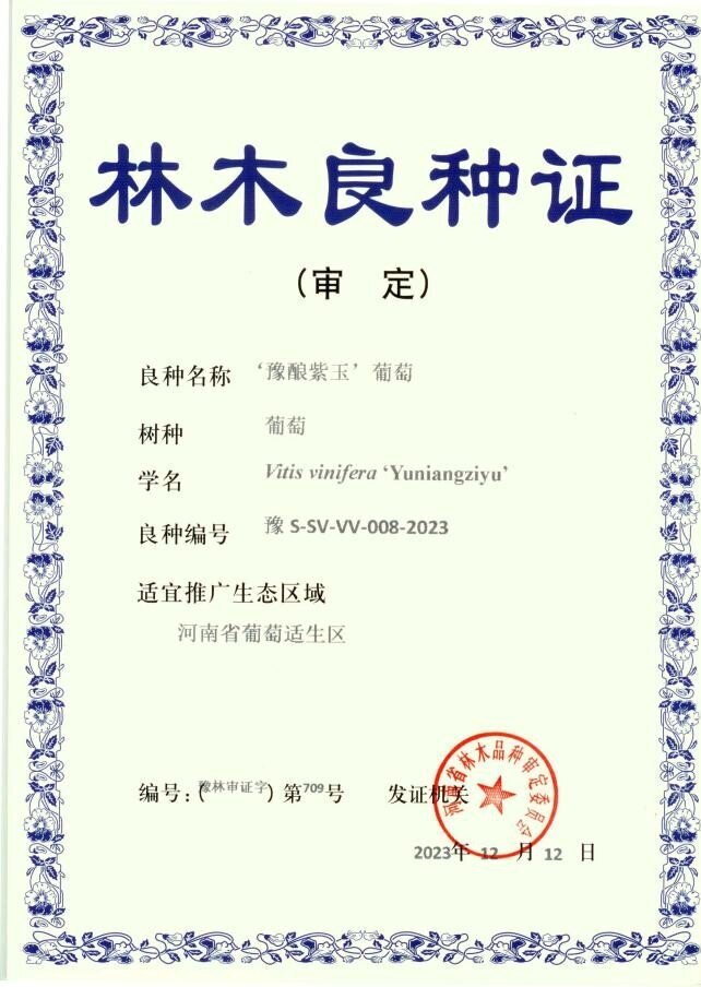 由威尼斯官网为第一完成单位、威尼斯官网教师王鹏老师主持选育的酿酒葡萄新品种‘豫酿紫玉’,通过河南省林木品种审定委员会审定,获河南省林木良种,在河南省葡萄适生区及与其相似其他葡萄适生区进行推广。‘豫酿紫玉’的选育工作自2005年开始,历经18年杂种育苗、大田栽植、初选优株、育苗复选、定选、区试、决选、酿酒等过程。该品种是我省首个通过杂交育种的方法获得的酿酒葡萄良种,填补了本土优质酿酒葡萄新品种的空白,摆脱了长期以来对国外酿酒葡萄品种的依赖。该品种的审定和推广,不仅提高了威尼斯官网的知名度和社会影响力,也为推进河南省酿酒葡萄产业的发展、豫酒振兴战略的实施、高质量发展建设现代化河南具有现实和深远的意义。