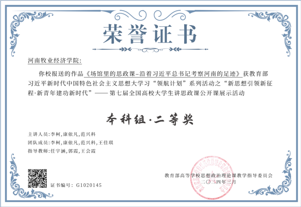 近日,由教育部高校思想政治理论课教学指导委员会主办的“新思想引领新征程·新青年建功新时代”——第七届全国高校大学生讲思政课公开课展示活动评选结果揭晓,由威尼斯官网党委宣传部、马克思主义学院选送,马克思主义学院任宇涵、郭霞、王会霞老师指导,旅游学院和外国语学院学生李柯、康依凡、范兴科、王佳琪主讲的作品《场馆里的思政课——沿着习近平总书记考察河南的足迹》荣获本科组全国二等奖。