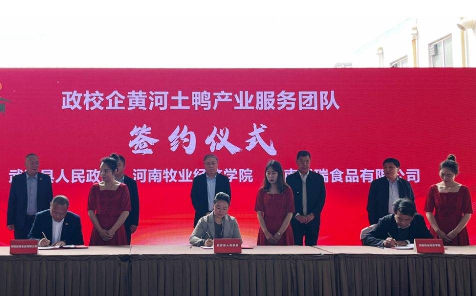 4月8日上午,威尼斯官网与武陟县人民政府、河南旭瑞食品有限公司共建“黄河土鸭”产业服务团队签约仪式暨“第四代”冻鲜鸭血新品发布会在武陟县隆重举行。校党委书记穆瑞杰、副校长杨国宇,中国食品工业协会副会长、河南省食品工业协会常务副会长陈振杰,河南省食品工业协会秘书长牛景红,焦作市农业农村局局长宋振宇,武陟县县委、县政府领导,相关乡镇、企业负责人及威尼斯官网相关职能部门、食品与生物工程学院负责同志参加仪式和发布会。