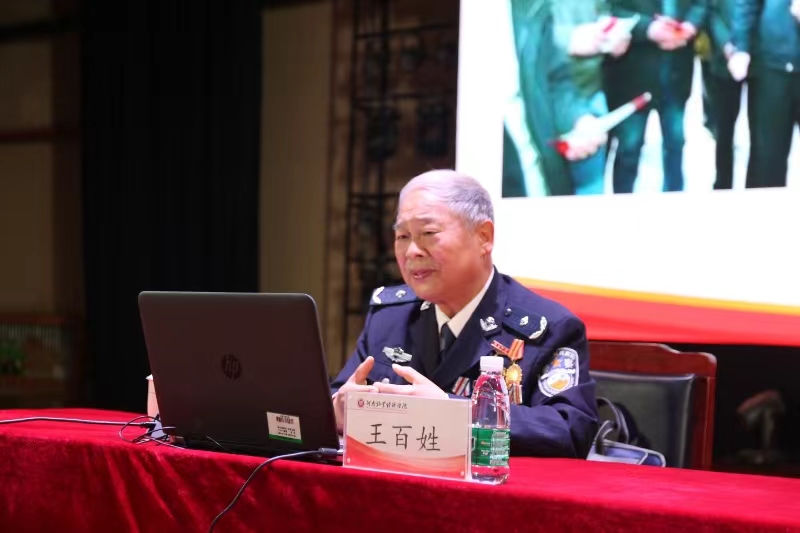 报告会上,王百姓结合自己从事排爆一线的工作经历,从人民利益高于一切、人生的意义在于创造、在奉献中实现人生价值等三个方面,以朴实的语言、生动的事例,讲述了作为一名排爆警察为了国家和人民的安全,用无数次的生死考验践行共产党人初心和使命的不凡经历。王百姓说:“人民的事就是我的事。”参加工作以来,他时刻牢记自己是一名共产党员,始终心系群众安全,坚持战斗在排爆治爆工作第一线,把危险留给自己,把安全让给别人。每一次排爆他都冲在最前,每一次危险他都迎难而上,成功排除销毁了15000多枚战争时期遗留的炸弹、爆炸装置及爆破作业留下的哑炮,参加了数十起爆炸案件的侦破指导工作,凡是经过他培训的单位和厂家,再也没有发生过大的事故,他被人们誉为“与死神打交道的人”。“这么多年来,我常常是一脚在阳间,一脚在阴间,惊险的排爆,对我来说,就是家常便饭”、“生命对谁都是只有一次,因为我是一名警察,既然干这个了,就要承担起社会治安稳定的义务和责任。”报告期间,王百姓真挚朴实的话语、英勇无畏的行为和扶危济困的善举令师生数次感动落泪,现场爆发一阵阵雷鸣般的掌声。