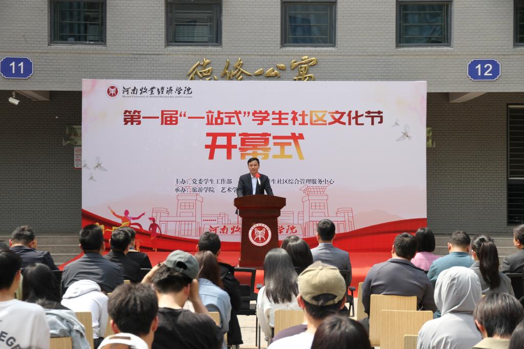 开幕式上,校党委学工部部长郝景昊宣读了《关于举办第一届“一站式”学生社区文化节的通知》,就社区文化节活动内容、活动要求作出部署和要求。动物科技学院党委副书记李建伟分享了“一站式”学生社区工作经验。英才校区学生社区自律会干事、金融与会计学院学生李楷楠作为学生代表发言。
