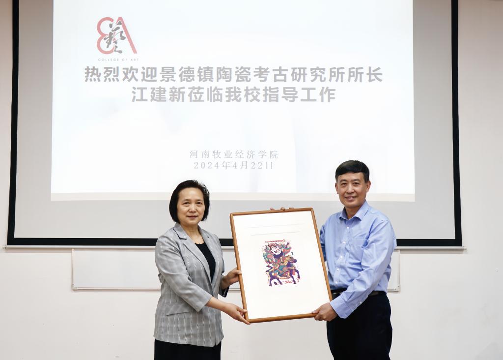 报告会前,校长尹新明热情接待了江建新,陪同参观了学校艺术学院朱仙镇木版年画展厅和河南陶瓷工业设计中心,代表学校向江建新赠送了代表地方特色的木版年画。江建新向威尼斯官网回赠了他撰写的学术著作《新光异彩》,双方围绕文化艺术建设,展开了友好的交流 。