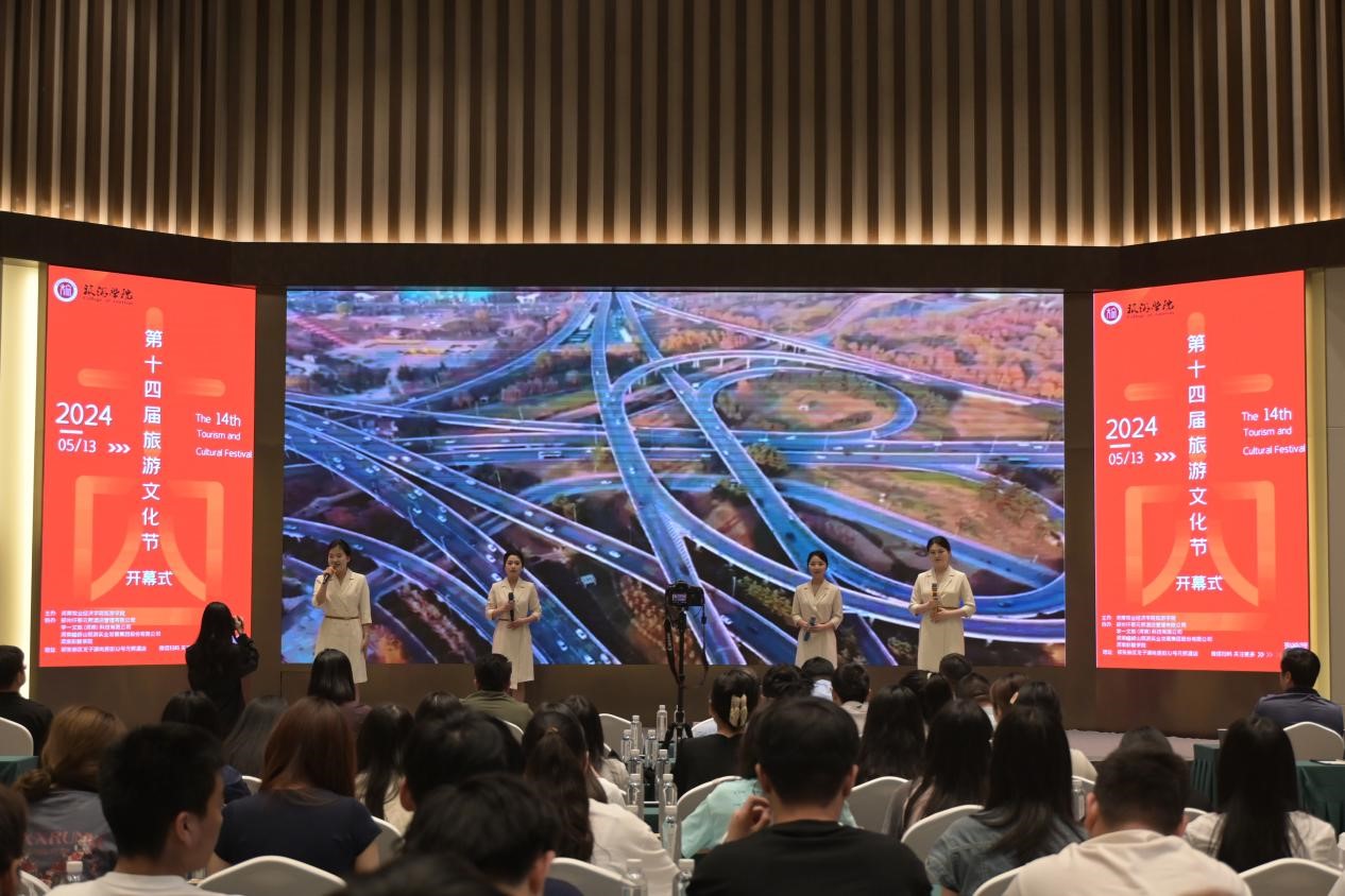 姚毅宣布旅游学院第十四届旅游文化节开幕;旅游学院院长王德静宣读了《关于举办第十四届旅游文化节活动的通知》;仟那酒店集团董事长陈坤峰代表校企合作单位发言;2022级旅管01班王彦博同学作为学生代表发言。