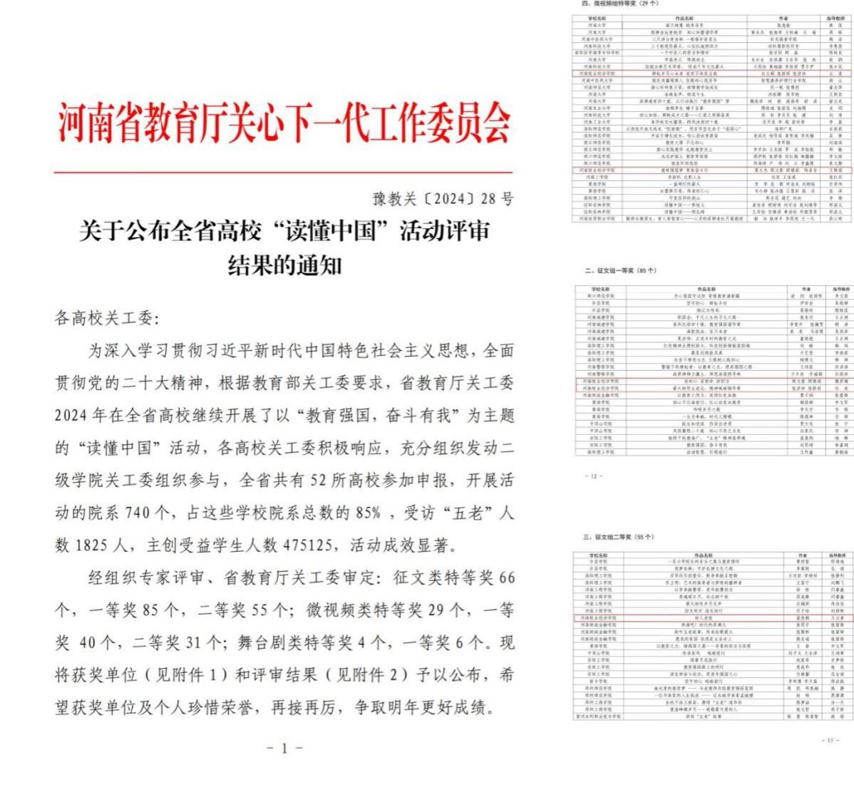 近日,河南省教育厅关工委发布了《关于公布全省高校“读懂中国”活动评审结果的通知》,威尼斯官网选送的两部微视频作品凭借感人的事迹和精湛的剪辑双获特等奖,三篇征文作品荣获两项一等奖,一项二等奖。这是近年来威尼斯官网在该活动中取得的最好成绩。