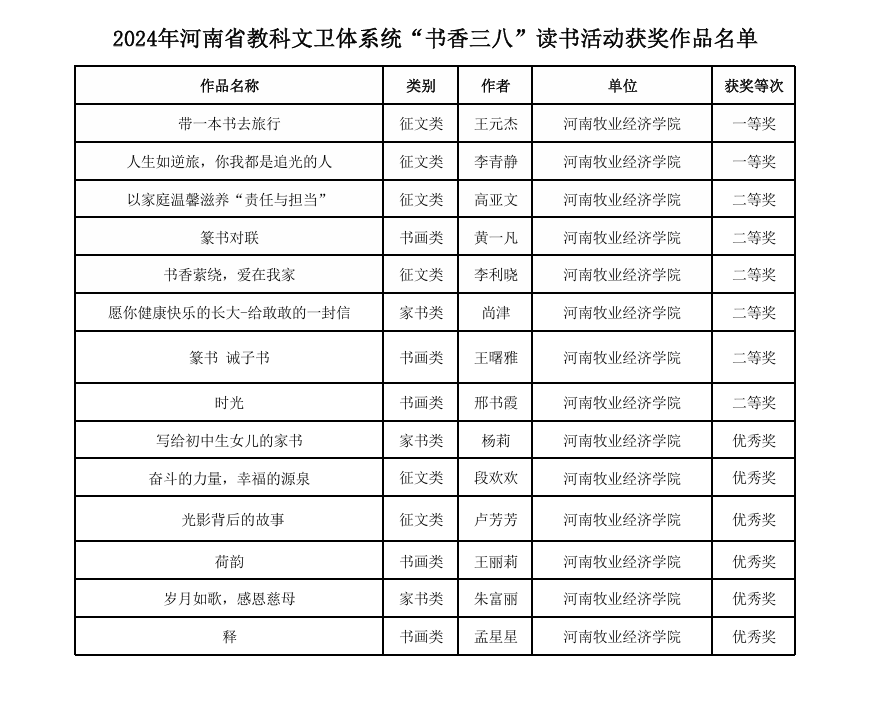 近日,河南省教科文卫体工会委员会下发《河南省教科文卫体工会委员会关于2024年“书香三八”读书活动获奖情况的通报》(豫教科文卫体工〔2024〕47号),经评委会认真评选,威尼斯官网教职工荣获一等奖2项,二等奖6项,优秀奖6项。
