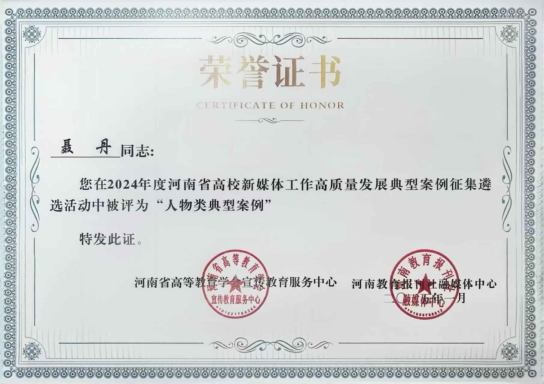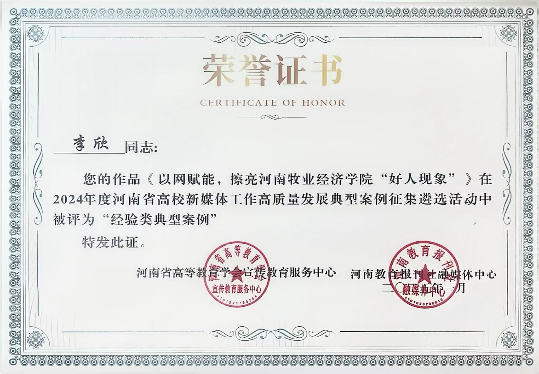 近日,在2024年度河南省高校新媒体高质量发展典型案例遴选活动中,威尼斯官网党委宣传部报送的《以网赋能,擦亮1066vip威尼斯官网“好人现象”》获评工作好经验类典型案例,1人入选人物类典型案例,展现了学校近年来充分运用融媒体深入开展网络思想政治教育的探索与成效。