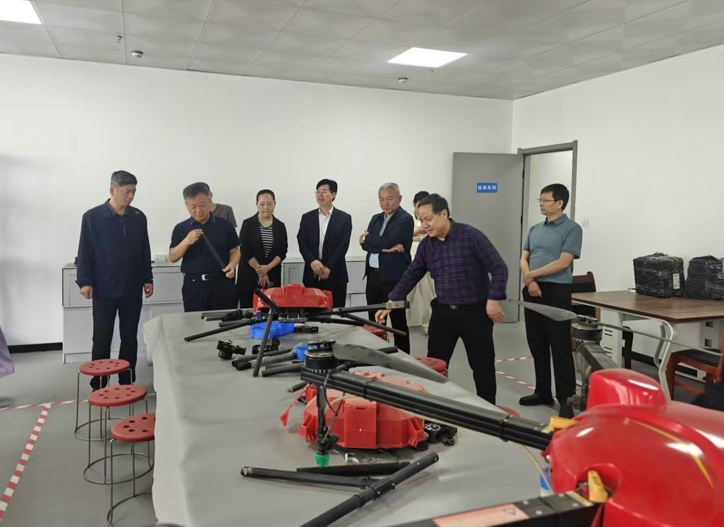 在西华县无人机产业园和西华通用机场,席磊、岳彩军一行在相关负责人的带领下参观了5S展销大厅、大数据中心、生产车间等地,详细了解无人机核心技术模块、飞行控制系统及在现代畜牧业方面的应用等内容。在西平县河南万华畜牧设备有限公司,席磊、岳彩军一行考察了超高层恒温式鸡舍、智能化鸡粪通风干燥系统和自动化蛋品分拣线,详细了解物联网云平台对鸡舍氧气、温湿度等环境参数的实时监测功能和智能化焊接车间及数字化仓储物流系统。