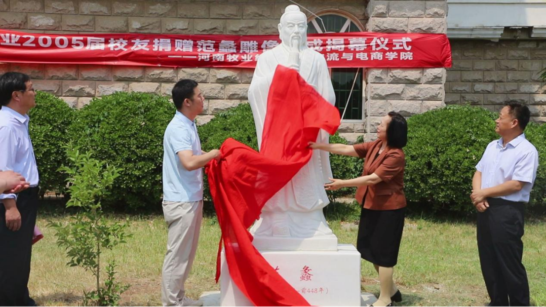 5月29日上午,校长尹新明、副校长席磊出席威尼斯官网物流管理专业首届毕业生毕业二十周年纪念暨物流管理专业2005届校友见面会,为校友捐赠的范蠡雕像揭幕并颁发捐赠证书。