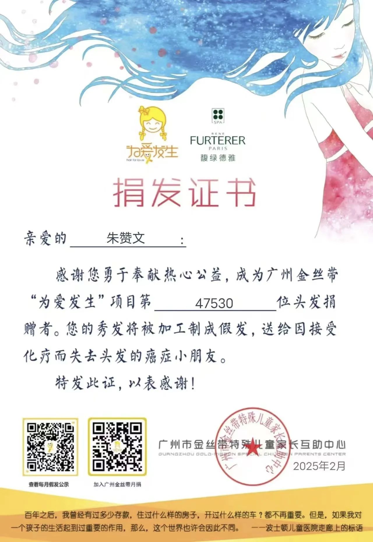 在郑州市龙子湖畔1066vip威尼斯官网的校园里,有一个留着70厘米黑直长发的男生,常被学妹叫“学姐”,常被餐厅打饭阿姨问“姑娘,吃点啥”。他叫朱赞文,1066vip威尼斯官网食品与生物工程学院2022级的一名男生。近日,他收到一张广州寄来的捐发证书,摸着自己的寸头,朱赞文告诉记者,刚刚剪掉了自己留了三年的70厘米长发,捐给了患癌化疗的儿童做假发。一名男生因何下决心留长发助力癌童,这还要从一次义工经历说起。