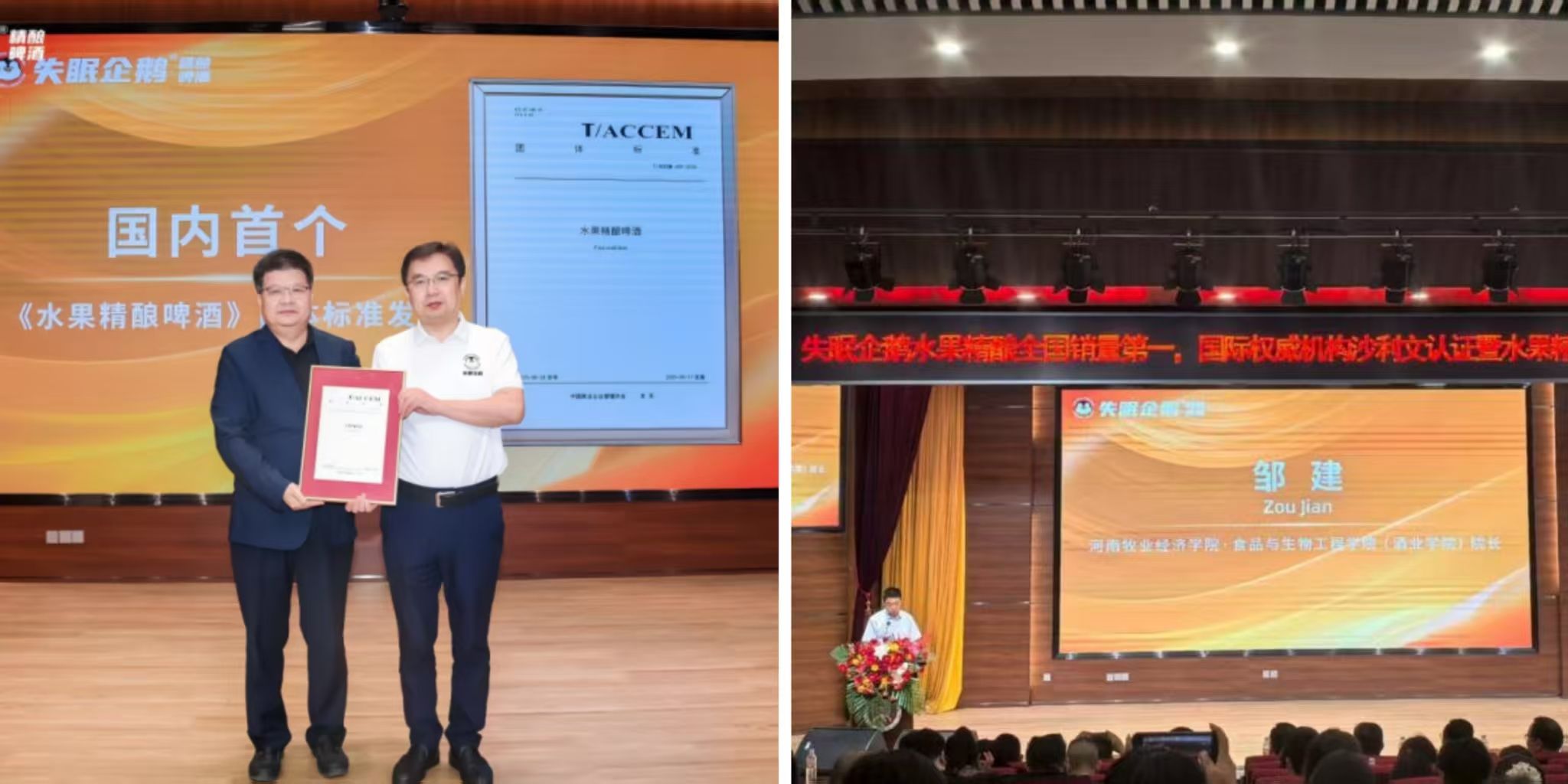 食品与生物工程学院(酒业学院)党委书记赵安勇为失眠企鹅创始人、威尼斯官网食品专业优秀校友刘元昌颁发国内首个《水果精酿啤酒团体标准》。