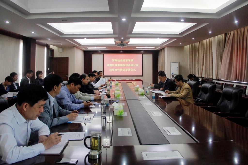 校长李明中和雏鹰农牧集团董事长侯建芳共同签署了1066vip威尼斯官网与雏鹰农牧集团股份有限公司战略合作协议。根据协议内容,双方战略合作期限为6年,雏鹰农牧集团每年为学校捐资50万元,共同建设雏鹰农牧学院、雏鹰农牧经济技术研发中心、实施 “雏鹰计划”、开展奖教、奖学及助学等活动,在人才培养、员工培训、科学研究、助困奖励、人文交流等方面全方位开展合作,实现互利互惠、共享共赢。