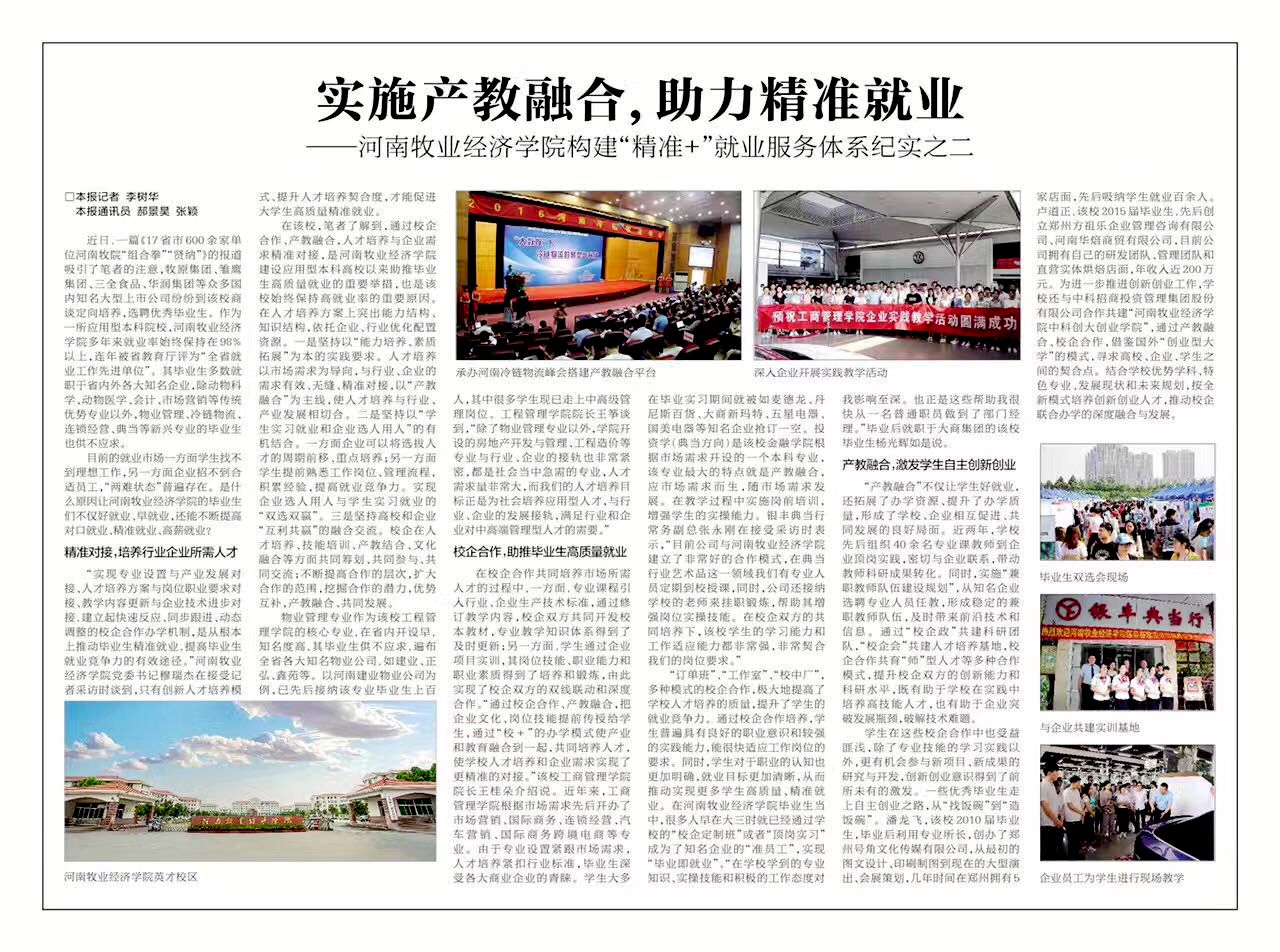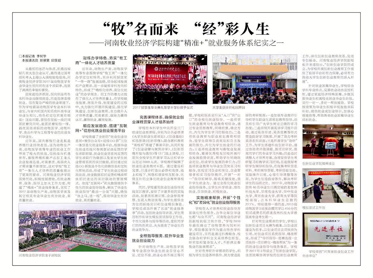 7月3日-4日,《河南日报》分别以《“牧”名而来 “经”彩人生》(相关链接:http://newpaper.dahe.cn/hnrb/html/2017-07/03/content_160891.htm)和《实施产教融合 助力精准就业》(相关链接:http://newpaper.dahe.cn/hnrb/html/2017-07/04/content_161463.htm)为题报道了威尼斯官网积极构建“精准+”就业服务体系促进学生成长成才相关经验做法。全文转载如下: