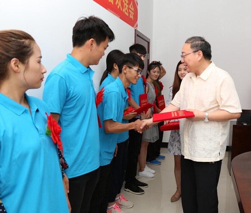 7月21日,学校在龙子湖校区图书馆625会议室举行2017年大学生西部计划志愿者欢送会。校党委书记穆瑞杰,校长李明中,校党委副书记、副校长曾照烨及相关职能部门负责同志出席会议,与即将奔赴服务地的8名志愿者话别践行。
