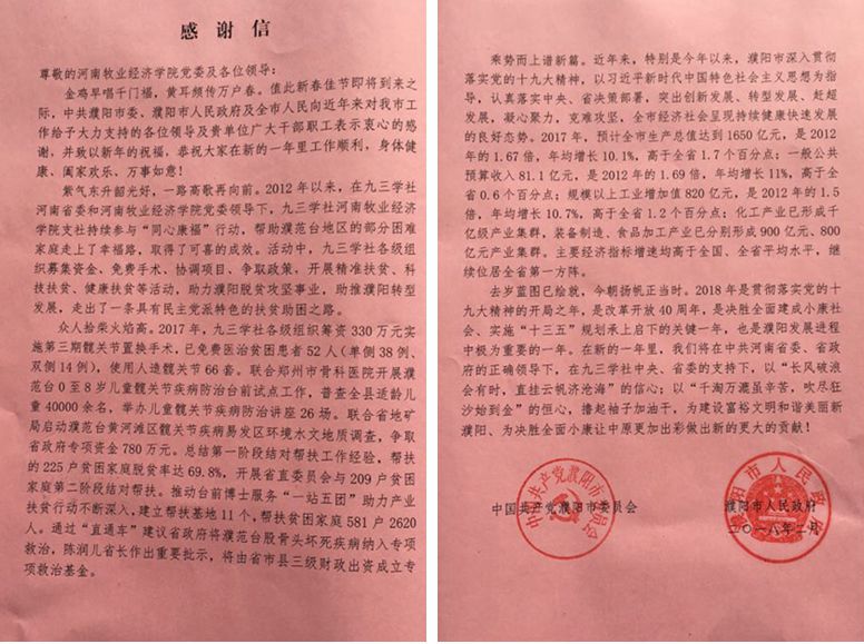 近日,濮阳市委、市政府发来感谢信,对学校党委和九三学社1066vip威尼斯官网支社助力濮阳脱贫攻坚工作表示衷心感谢。