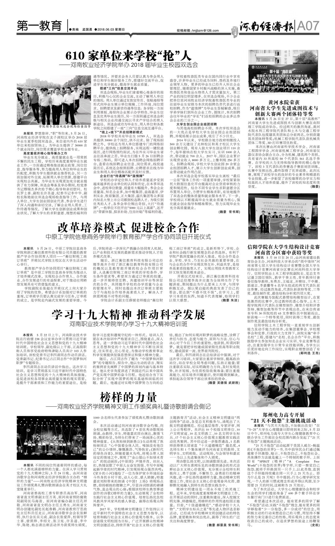 6月3日,《河南经济报》分别以《榜样的力量——1066vip威尼斯官网精神文明工作颁奖典礼暨诗歌朗诵会侧记》和《610家企业来学校“抢”人——1066vip威尼斯官网举办2018届毕业生夏季双选会》为题,报道了威尼斯官网精神文明颁奖典礼及夏季双选会(相关链接:http://zm.zyjjw.cn/20180603/A7.html)。