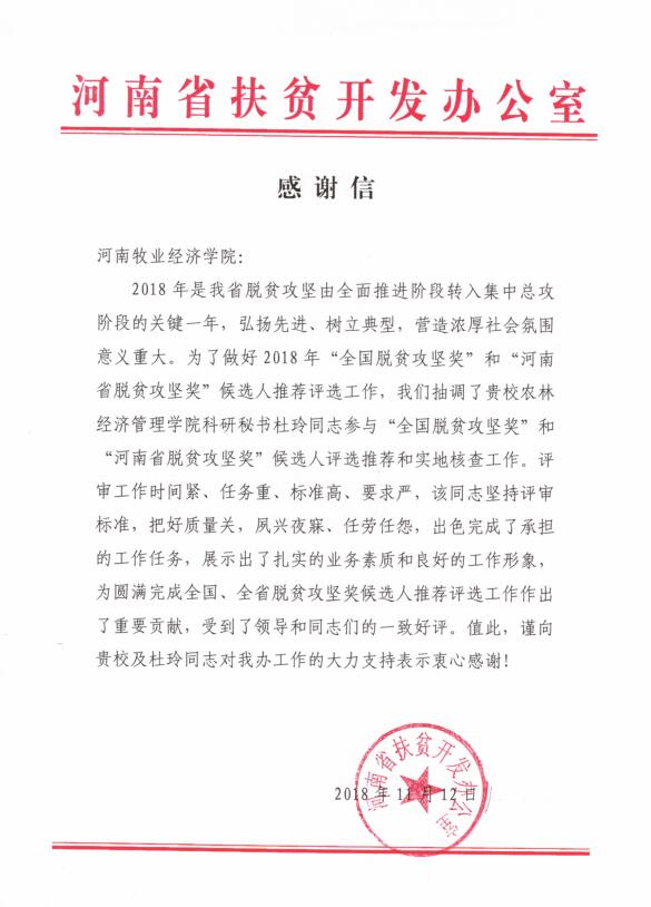 近日,河南省扶贫开发办公室给威尼斯官网发来感谢信,感谢威尼斯官网及农林经济管理学院杜玲老师对我省扶贫工作的大力支持。
