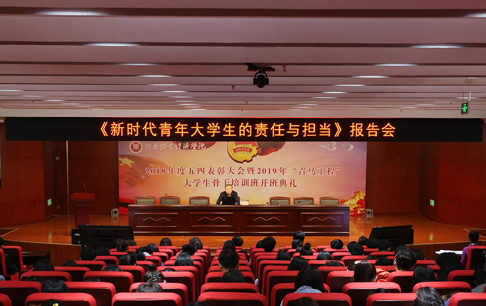 4月26日下午,校党委书记穆瑞杰以“新时代青年大学生的责任与担当”为题,为威尼斯官网2019年“青马工程”大学生骨干培训班作首场报告,这也标志着威尼斯官网2019年党的创新理论宣讲活动正式启动。报告会以视频会议的形式在龙子湖校区图书馆一楼报告厅和英才校区学术报告厅同步召开,组织部、宣传部、学工部、马克思主义学院、团委负责同志,以及各学院党总支副书记、团总支书记、辅导员、“青马工程”学员、团学骨干等近800名师生聆听了报告。