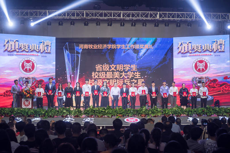 颁奖典礼上,校党委书记穆瑞杰为2018年度学生工作先进单位颁奖;校长罗士喜为2018年资助工作先进单位及全优宿舍优秀组织单位颁奖;副校长张卫宪为学生工作先进个人颁奖;校纪委书记李中华为“十大体育竞技之星”“十大道德之星”“十大自强之星”“十大技能之星”和“百名学业之星”颁奖;副校长张伟为“十大优秀学生标兵”“十大优秀学生干部标兵”“十大创新创业之星”“十大文化艺术之星”颁奖;副校长陈艳为省级优秀班集体、省级文明班级、省级文明宿舍、2017-2018学年全优宿舍代表颁奖;副校长程慎为省级文明学生、校级最美大学生、校级文明标兵之星颁奖;副校长杨志清为国家奖学金获得者、省级优秀学生干部、省级三好学生代表颁奖。