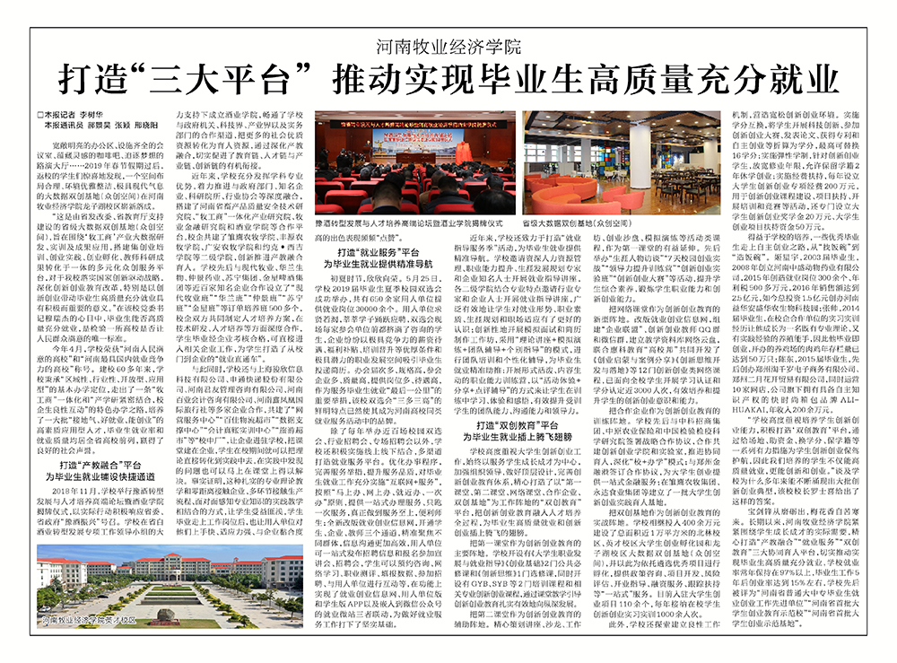 7月2日,《河南日报》以《打造“三大平台” 推动实现毕业生高质量充分就业》为题报道威尼斯官网紧紧围绕学生成长成才的实际需要,精心打造“产教融合”“就业服务”“双创教育”三大协同育人平台,切实推动实现毕业生高质量充分就业相关情况。(相关链接:http://newpaper.dahe.cn/hnrb/html/2019-07/02/content_350462.htm?from=timeline)全文转载如下: