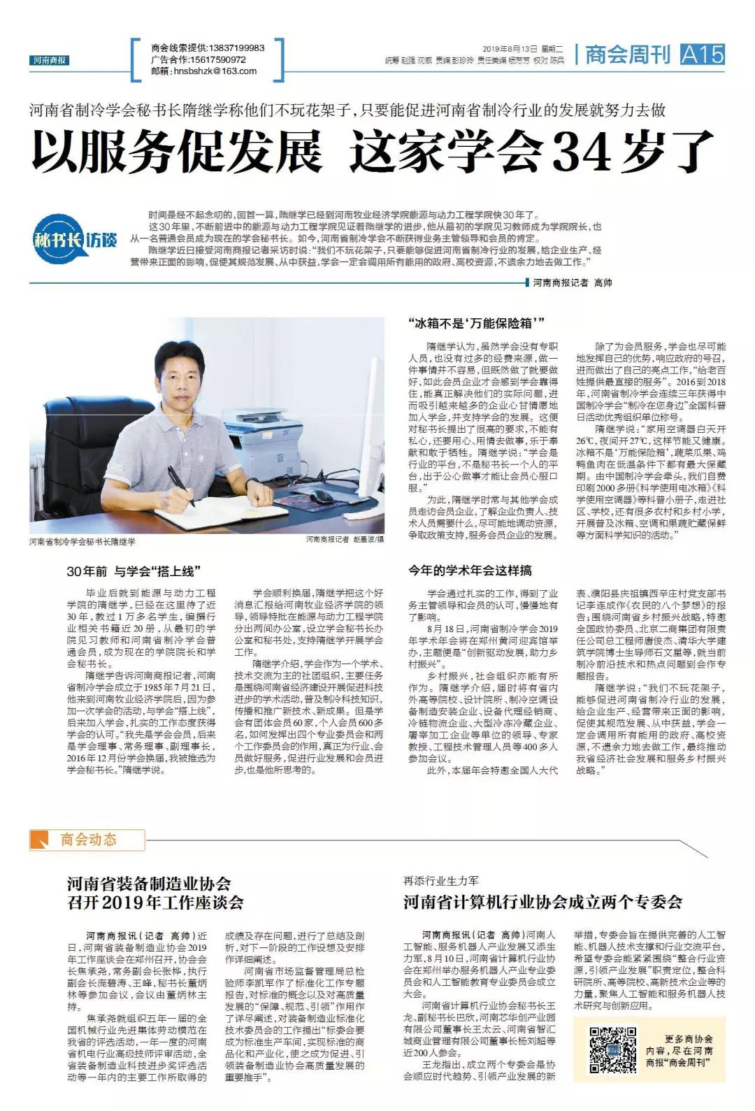 近日,《河南商报》以《以服务促发展 这家学会34岁了》为题报道了威尼斯官网能源与动力工程学院院长兼河南省制冷学会秘书长隋继学在学校的大力支持下,响应政府号召,发挥专业优势,带领学会服务行业发展,促进科技进步等相关事迹。