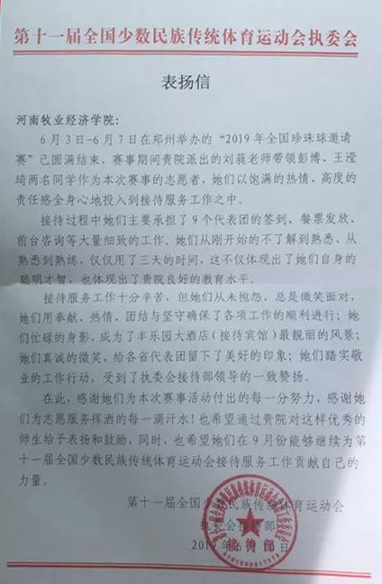 近日,中共河南省委、河南省人民政府下发了《中共河南省委、河南省人民政府关于奖励和通报第十一届全国少数民族传统体育运动会筹办工作中表现突出单位和个人的决定》(豫文〔2019〕147号),对在2019年9月8日至16日第十一届全国少数民族传统体育运动会中表现突出的志愿者和干部群众予以奖励和通报,威尼斯官网荣获“集体嘉奖”;校团委副书记王鑫磊荣获“个人嘉奖”;动物科技学院的王密、旅游学院的刘蕤、张琳婧和动物医药学院的付文凯四位辅导员老师被通报表扬。(宣传部 田景丽/文 团委 杨莉/图)