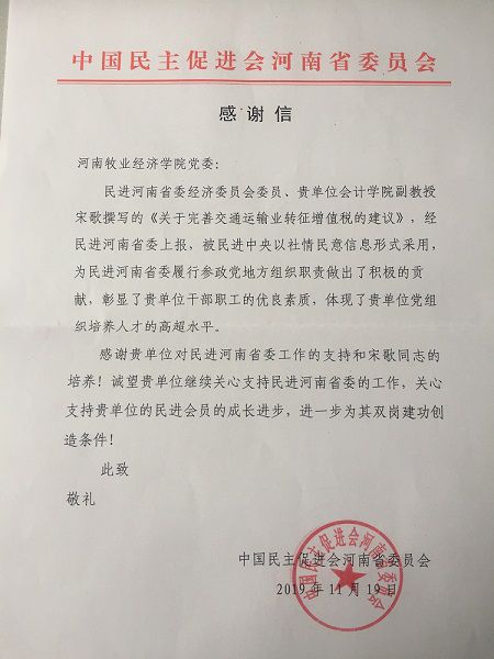 近日,从中国民主促进会河南省委员会传来消息,民进1066vip威尼斯官网支部会员、金融与会计学院宋歌副教授撰写的《关于完善交通运输业转征增值税的建议》被民进中央采用。