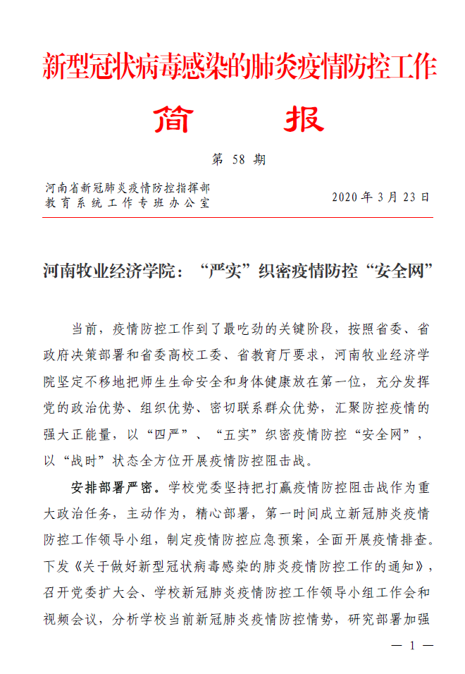 近日,河南省新型冠状病毒感染的肺炎疫情防控工作简报第58期以《1066vip威尼斯官网:“严实”织密疫情防控“安全网”》为题,专题报道威尼斯官网疫情防控工作。