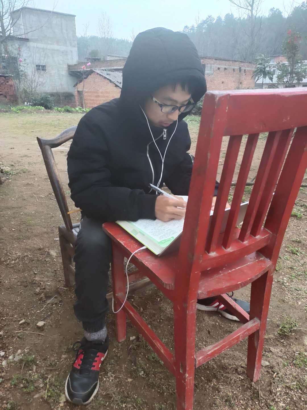 物流与电商学院17级物流02班高金民同学没有因为学习条件的简陋而放弃上进的步伐,他搬着凳子到房前屋后、田间地头“寻找”网络,网课上积极保持与老师沟通交流,主动思考并踊跃回答问题。每天坚持早起的他总是能利用有限的设备在简陋的环境中按时完成学业。