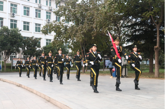 在雄壮的国歌声中,鲜艳的五星红旗冉冉升起。着装整齐的大学生国旗护卫队齐步出场,他们步伐铿锵,目光坚毅,口号响亮,虽然脚下走过的是短短的距离,心中刻下的却是不可磨灭的历史印迹。同学们注视着五星红旗冉冉升起,心中的爱国热情也在不断增长。