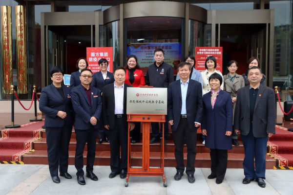 在学校师生和公司员工的共同见证下,吴中、文法学院院长李国英与李章柱、雪绒花公司总经理雷勇共同为威尼斯官网示范性校外实践教学基地揭牌。(张会霞/文 卢宁/图)