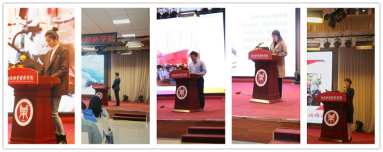 报告会在记录抗疫点滴的微视频《青春答卷》中拉开帷幕,一幕幕激荡人心的战疫镜头,把师生拉回到那段不平凡的抗疫岁月。讲师团成员、中建七局安装工程有限公司郑州岐伯山医院安装突击队队长梁少智通过“突击,突击,哪里需要奔哪里”的主题演讲,展现了岐伯山医院拔地而起时青年建设者争分夺秒、日夜奋战的场景,彰显了建筑青年知难而进,迎难而上的时代责任感,弘扬了“无畏,勇敢,青春,向上”的青年突击队精神,呼吁青年学生肩负时代赋予的使命,用青春力量争做新时代共和国的脊梁;郑州市金水区南阳路街道亨利社区党委书记杨雪以“守好后方‘主战场’”为主题向观众讲述了疫情防控期间繁忙艰巨的社区工作,凸显出党员干部的先锋模范作用及人民群众的理解与配合对疫情防控做出的重大贡献;90后青年志愿者代表苏桠通过“让青春在志愿服务中绽放绚丽之花”讲述了她作为一名抗疫志愿者日常“扫楼”登记、入户排查、社区卡点值守的志愿服务工作,她说:“这是一场让我终身难忘的志愿服务,这是一场教我实践成长的志愿服务。”作为中国新时代青年,他们用点滴爱心凝聚志愿力量,以点滴服务促进社会进步。不畏艰辛、冲锋在前、真情奉献,踊跃投身疫情防控人民战争,展现了当代中国青年的担当精神;郑州人民医院驰援湖北医疗队青年突击队队长仝麟龙在演讲“逆行而上,践行党员初心和使命”中回忆起他逆行而上,出征江城的心历路程,动情的讲述了他在武汉方舱医院工作的经历,他说“世代行医,不辱门楣”,这是父亲对自己的嘱托,也是党和国家对自己的希望,面对国旗和党旗,面对未知的风险和困境,作为一名党员,我们会坚持自己无悔的承诺,让青春在党和人民最需要的地方绽放绚丽之花;河南财经政法大学国际教育学院团委书记张晓静用生动的语言阐释了中国特色社会主义制度和国家治理体系,强调制度自信及青年的责任与担当。她指出我们要不负习近平总书记的嘱托,把青春梦融入中国梦,在制度自信中诠释青春担当,在砥砺奋进中书写出精彩人生!