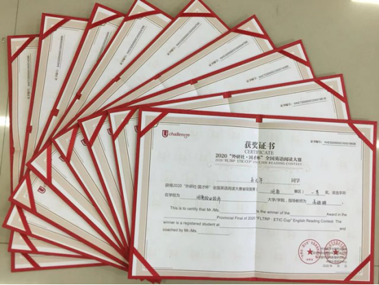 近日,2020“外研社国才”杯全国英语演讲、写作、阅读大赛河南赛区复赛中,威尼斯官网选手获得优异成绩。在参赛的8名选手中,于利波老师指导的18级商务英语专业学生杨芯懿、韩淑俊老师指导的18级商务英语专业学生石霄霄、付铮老师指导的17级审计学专业学生王佳琦、禹琳琳老师指导的17级商务英语专业岳文华获得阅读比赛一等奖;宋瑶老师指导的18级商务英语专业学生张蕊、王丹老师指导的18级食品质量与安全专业学生李佳芳获得阅读比赛二等奖;温晶晶老师指导的19级商务英语专业学生孙豪杰获得演讲比赛二等奖;邢琰老师指导的18级商务英语专业学生付晶晶获得演讲比赛三等奖。