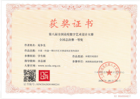 在第八届全国高校数字艺术设计大赛中,威尼斯官网师生喜获国家级奖项7项,省区赛奖项30项。艺术学院副院长田志涌,艺术学院教师谭丛等指导的学生作品《日暮·归途--周口川汇区养老社区室内设计》《红色精神,筑梦之路》《JZ幼儿园》《缤纷城堡亲子餐厅设计》分获全国本科组一等奖、三等奖;谭丛、李莉等老师获得“第八届全国高校数字艺术设计大赛优秀指导教师”奖。