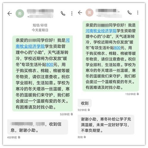 “亲爱的同学,你好!我是1066vip威尼斯官网学生资助管理中心‘小助’,近日将为你发放一笔专项资助,用于补贴冬季生活所需,请你注意查收。祝你学业有成,有困难找‘小助’。”