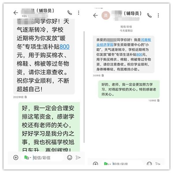 寒冬送温暖,资助伴成长。此次活动是学校根据各二级学院摸排学生家庭经济状况和大数据分析学生日常消费状况,有针对性开展的一项“隐性资助”活动,在帮助学生的同时,注意保护学生隐私。生活补贴发放之后,辅导员老师通过短信向受资助困难学生发送温馨提示,将学校的温暖和关爱转化为学生奋发学习的不竭动力,进一步提升了育人成效。