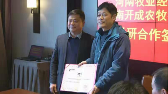 在热烈愉快的气氛中,1066vip威尼斯官网社会服务办主任胡迎利与河南开成投资集团董事长胡启成,分别代表学校和开成农牧签署了合作协议,开成农牧聘请动物科技学院刘健副教授为公司“技术总监”,并颁发了聘书。