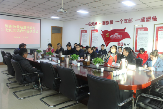 12月15日下午,学校与郑州二七纪念馆校馆合作签约仪式在英才校区教学楼327会议室举行。郑州二七纪念馆馆长张江山,学校副校长张卫宪出席签约仪式。郑州二七纪念馆产业发展部、社会教育部相关负责人,校社会服务办公室、经济与贸易学院、马克思主义学院主要负责人参加签约仪式。