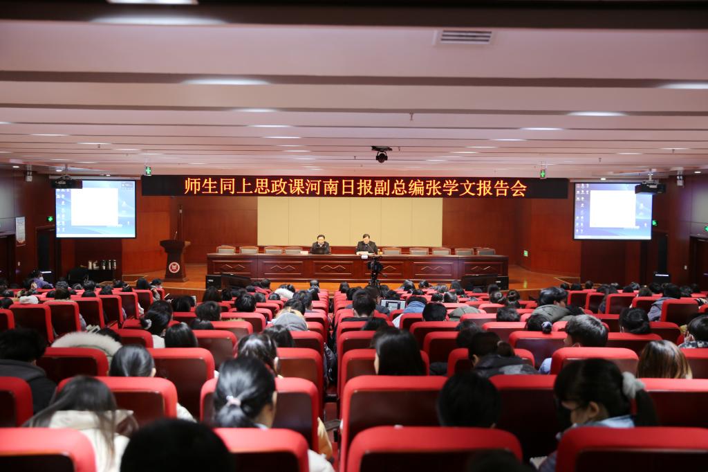 为深入学习贯彻习近平新时代中国特色社会主义思想,引导广大青年学生不断增强“四个自信”,矢志不渝听党话跟党走,争做中国特色社会主义合格建设者和可靠接班人,12月17日,学校在龙子湖校区图书馆1楼报告厅举办“领导干部上讲堂、师生共上思政课”报告会,学校特别邀请河南日报报业集团党委委员、副总编辑张学文作专题报告,校党委副书记李俊杰,宣传部、学工部、校团委相关负责同志及部分学生代表现场聆听了报告。报告会由李俊杰主持。